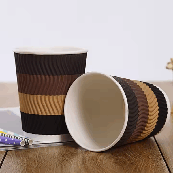A ripple wall paper cup is a type of disposable cup designed with an extra layer of insulation to improve heat retention and provide better insulation for hot beverages. These cups are commonly used in coffee shops, restaurants, and other establishments where hot drinks like coffee, tea, or hot chocolate are served. Ripple wall cups have a double-wall design that consists of an inner and outer layer of paperboard with an air pocket or ripple layer between them. This ripple layer creates insulation, helping to keep the beverage hot while making the cup more comfortable to hold without the need for an additional sleeve.