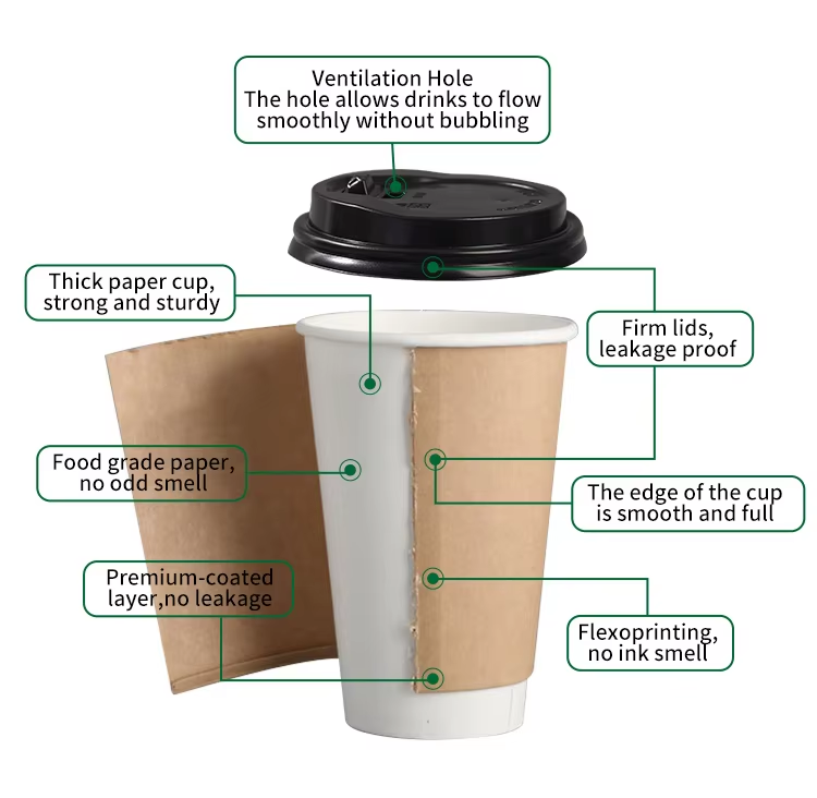 At PANDA,We offer food grade double wall disposable paper cups in very popular sizes of 8oz, 12oz, 16oz. These cups are safe, leak proof, high temperature resistant and not easy to deformation.
